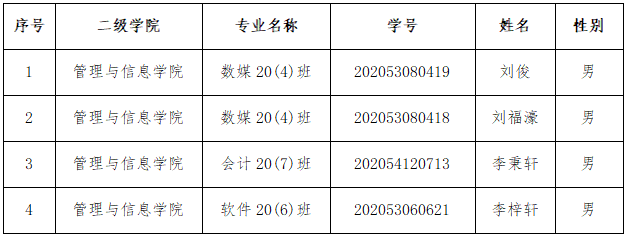 根据教育部《普通高校学生管理规定》(中华人民共和国教育部令第41号)第三章第五节及《天津机电职业技术学院学籍管理规定》第八节第四十六条中对学生退学处理的相关规定,我校现有4名学生因未在学校规定的最长修业年限内(学制+2年)完成学业(含休学)。经二级学院上报,教务部复核,校长办公会审议通过,决定对刘俊等4名学生进行学籍清退,现予以公示。